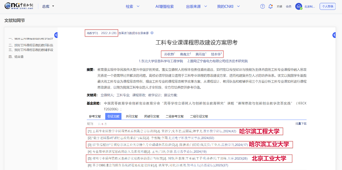 教师发表课程思政相关教研论文9篇,被上海交通大学、哈尔滨工业大学、西安交通大学、东南大学、华中科技大学、天津大学、山东大学、北京航空航天大学等100余所高校引用近170次,部分代表性成果及引用情况如下: