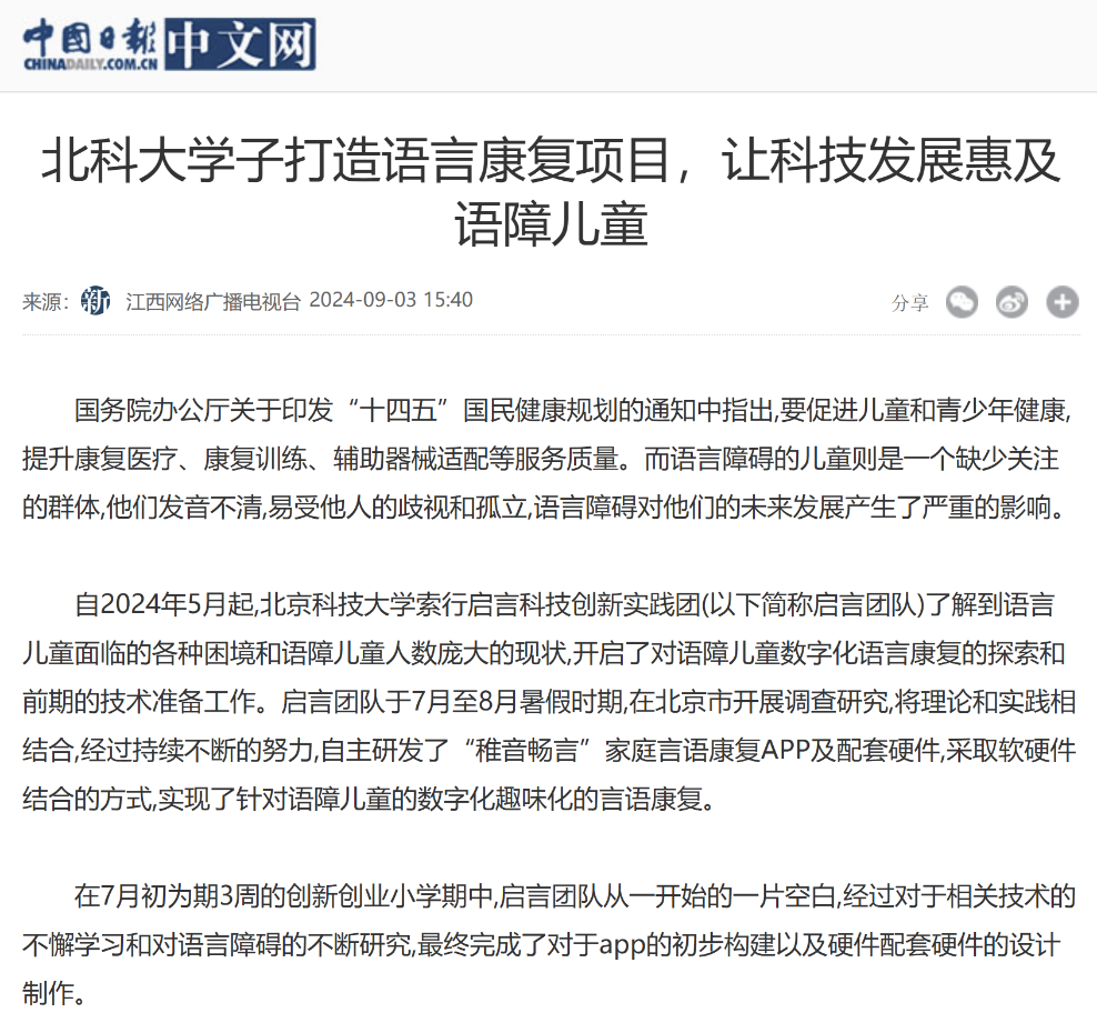[4] 中国日报对williamhill中国“索行启言”实践团助力语障儿童康复训练事迹进行报道