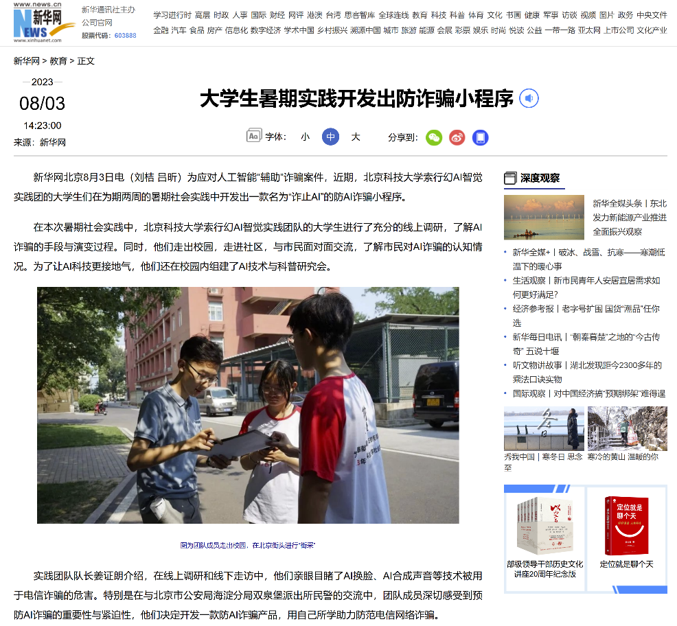 新华网对williamhill中国索行幻AI智觉实践团开发 “诈止AI”事迹进行报道