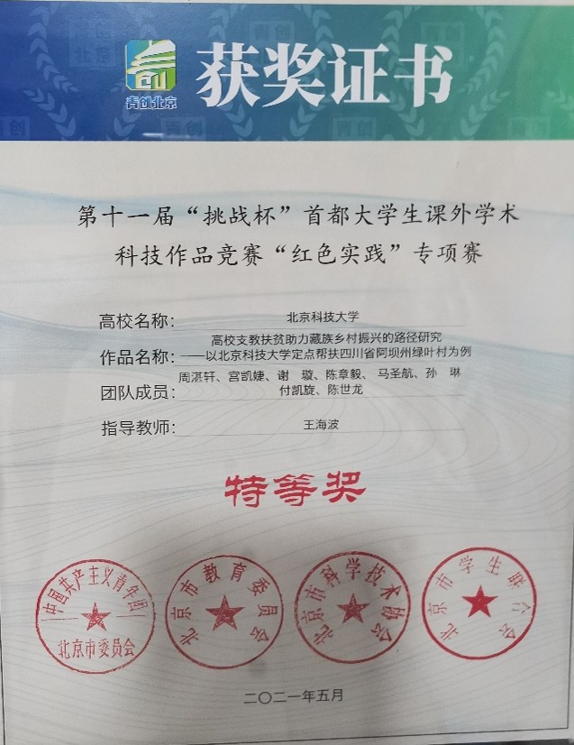 [12] 【三大赛获奖】2023年04月,“让科技扎根泥土:立足需求端的科技助农社会实践路径探索”参加“青创北京”2023年“挑战杯”首都大学生课外学术科技作品竞赛“青学二十大”红色专项赛,获省部级特等奖