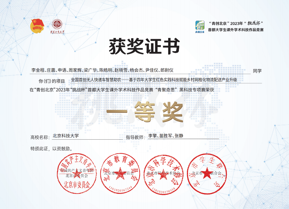 [18] 【三大赛获奖】2023年04月,“全国首创无人快递车智慧助农—基于四年大学生红色实践科技赋能乡村网格化物流配送产业升级”参加“青创北京”2023年“挑战杯”首都大学生课外学术科技作品竞赛“青聚奇思”黑科技专项赛,获省部级一等奖