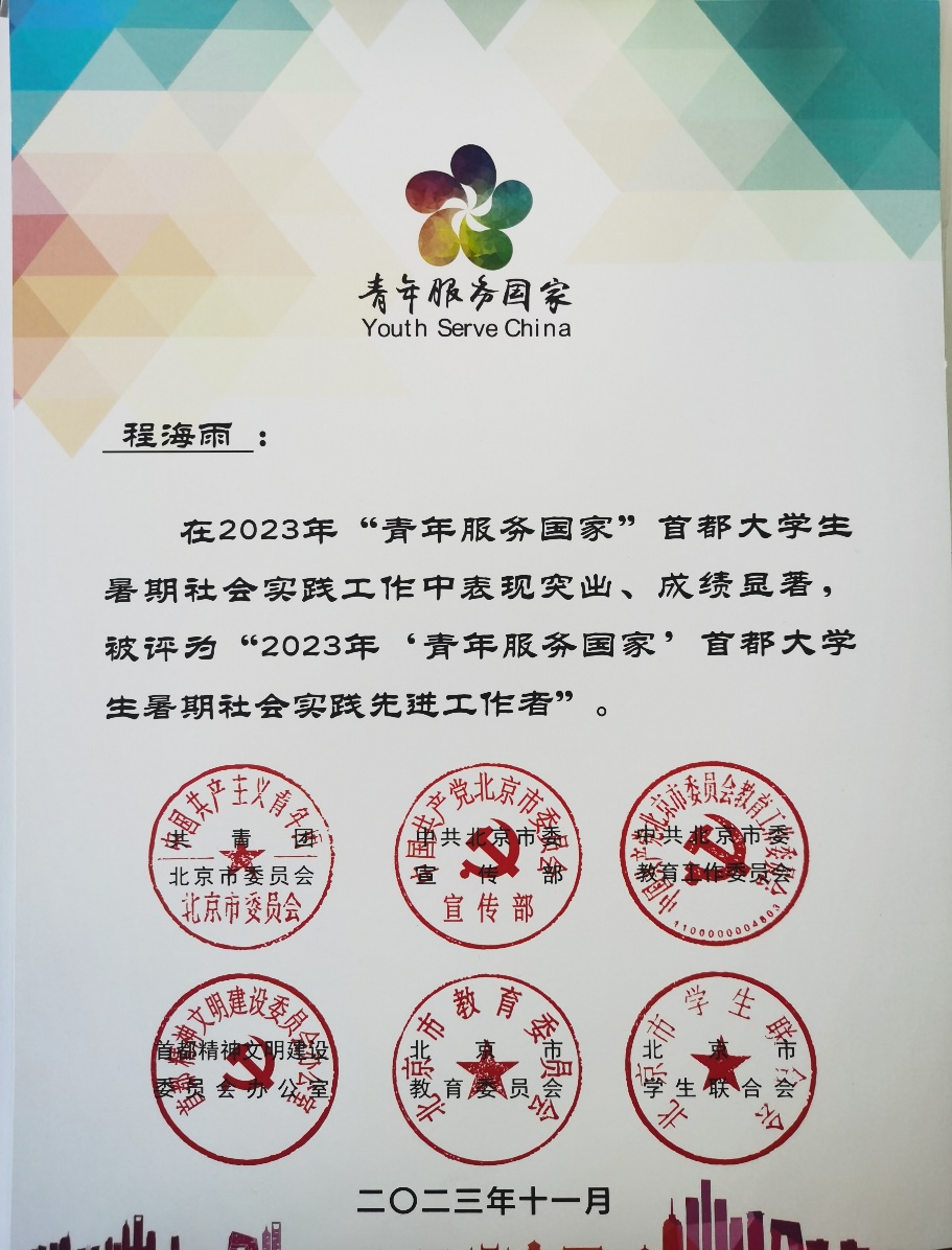[29] 【先进工作者】2023年11月,程海雨获首都大中专学生暑期社会实践先进工作者