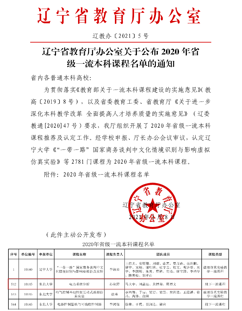 [36] 【优质课程奖】2022年11月,“电力系统分析”获辽宁省一流本科课程