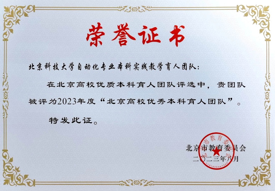[15] 【教学团队奖】2023年8月,自动化专业本科实践教学育人团队获北京高校优秀本科育人团队