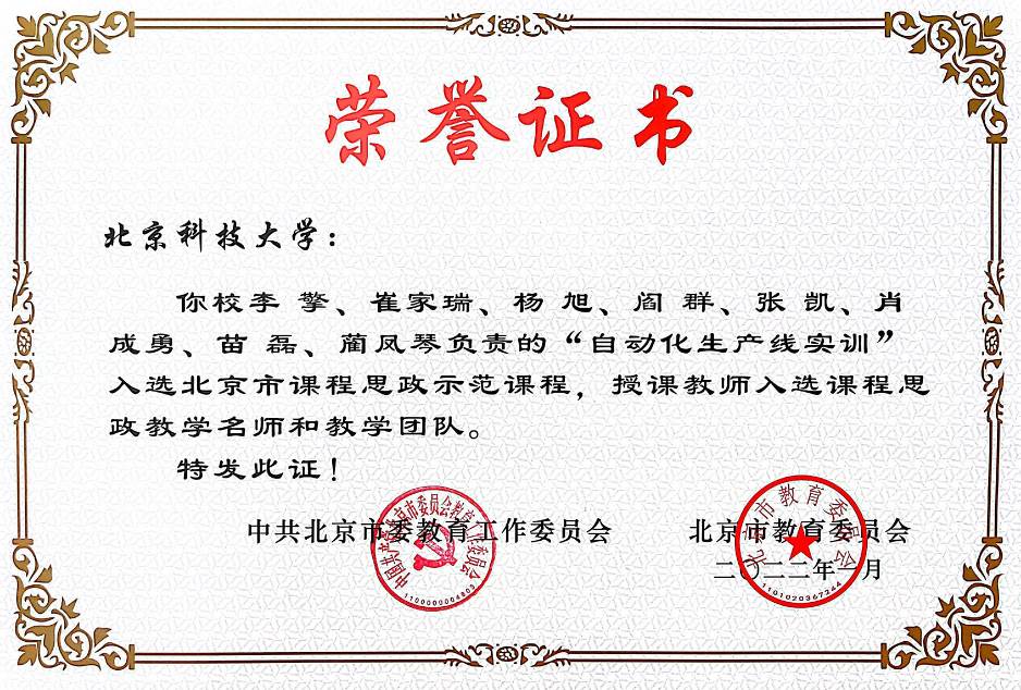 [14] 【课程思政示范课程、教学名师和教学团队奖】2022年1月,“自动化生产线实训”获北京市课程思政示范课程,授课教师入选教学名师、团队入选课程思政教学团队