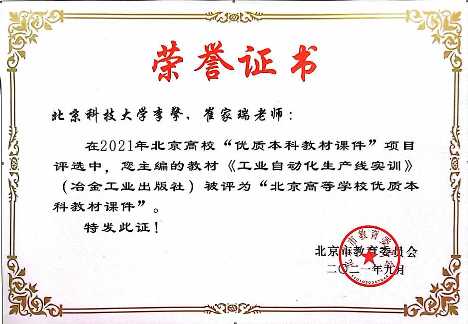 [39] 【优质教材奖】2021年9月,《工业自动生产线实训》获北京高等学校优质本科教材