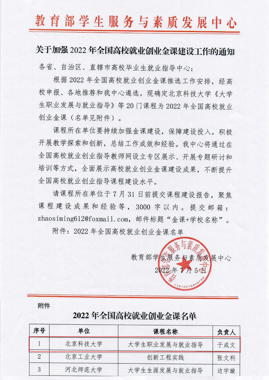 [11] 【教育部就业创业金课】2022年7月,大学生职业发展与就业指导获教育部高校就业创业金课