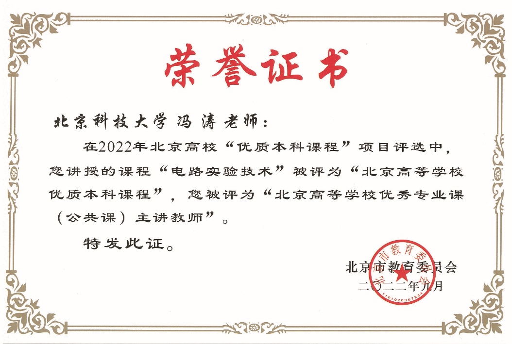 [33] 【优质课程奖】2022年9月,“电路实验技术”获北京高等学校优质本科课程