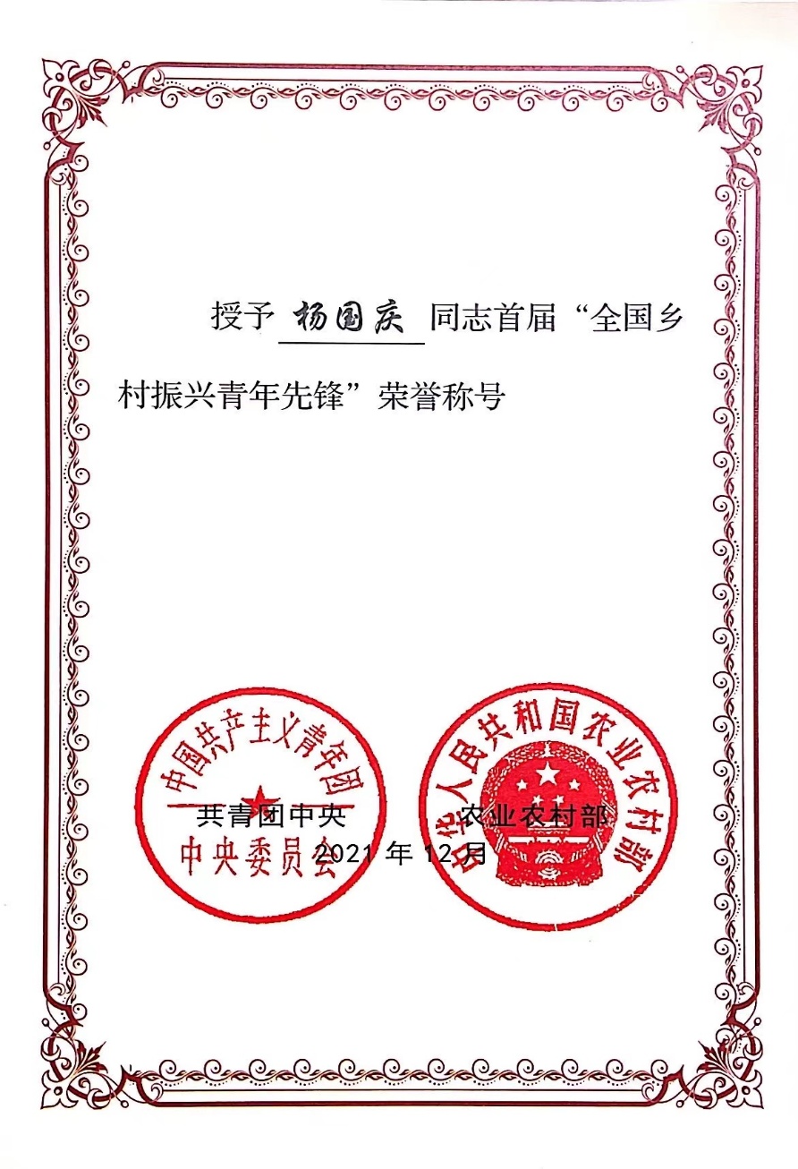 [13] 【青年先锋奖】2021年12月,杨国庆获首届“全国乡村振兴青年先锋”奖