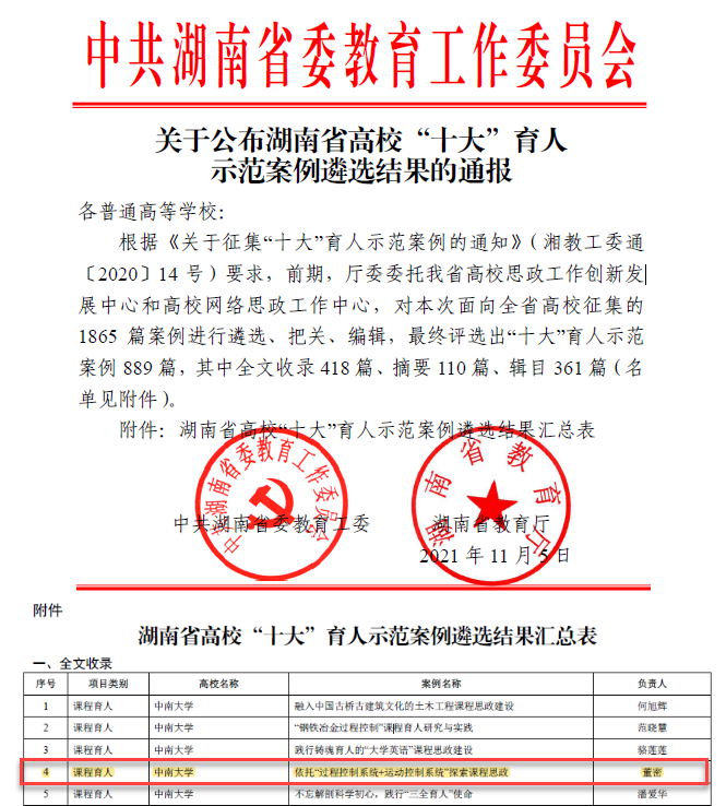 [17] 【育人案例奖】2021年11月,“依托‘过程控制系统+运动控制系统’开展课程思政探索”获湖南省高校“十大”育人示范案例